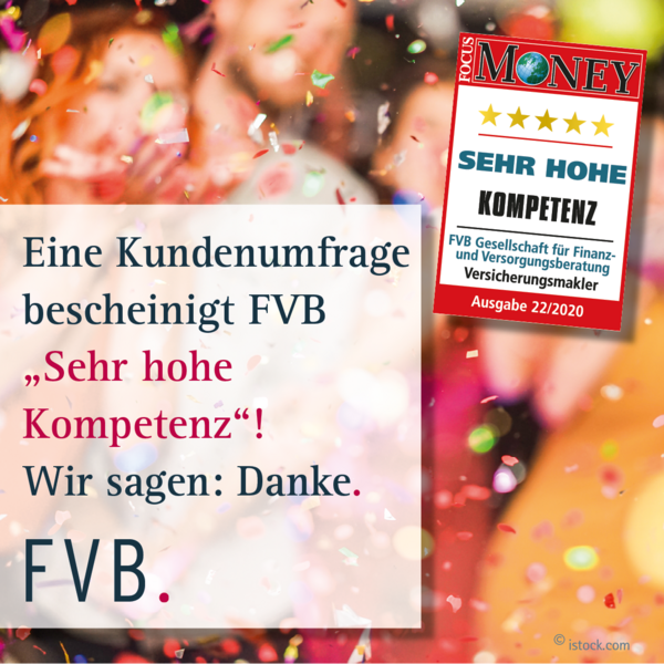 Kundenvertrauen muss verdient werden, bestenfalls mit Kompetenz. In einer repräsentativen Kundenbefragung von FocusMoney bekam FVB das Siegel „sehr hohe Kompetenz“. Wir sind stolz auf das entgegen gebrachte Vertrauen und sagen DANKE!